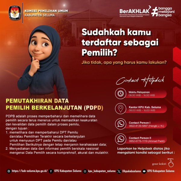 Bagi yang belum terdaftar sebagai pemilih, Pemilih yang ingin mengubah elemen data pemilih, dan Pemilih yang telah tidak memenuhi syarat, segera laporkan Ke KPU Kabupaten Seluma.