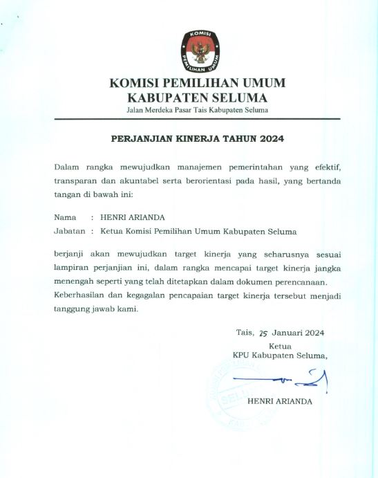PERJANJIAN KINERJA (PK) KPU KABUPATEN SELUMA TAHUN 2024