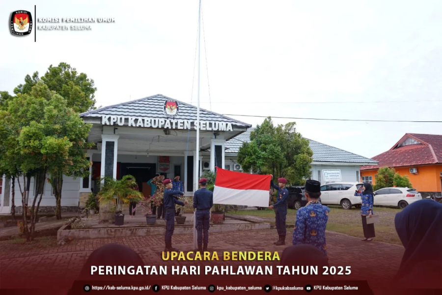 KPU Kabupaten Seluma melaksanakan Upacara Bendera dalam rangka Peringatan Hari Pahlawan Tahun 2025 pada Senin, 10 November 2025. Kegiatan yang berlangsung di halaman Kantor KPU Kabupaten Seluma ini diikuti oleh para komisioner, sekretaris serta seluruh pegawai sekretariat. Upacara berlangsung dengan khidmat sebagai wujud penghormatan dan penghargaan kepada para pahlawan bangsa yang telah mengorbankan jiwa dan raganya demi kemerdekaan Indonesia.