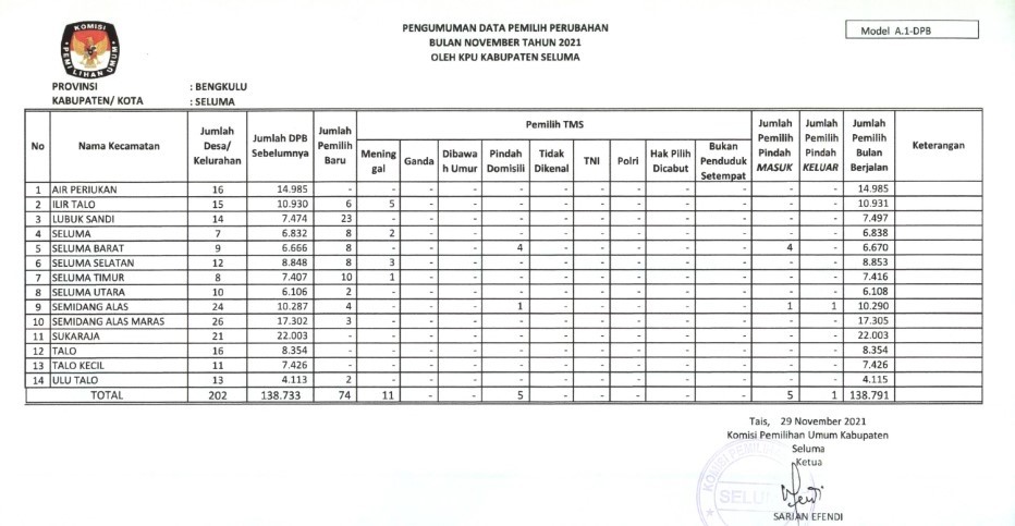 Berikut kami informasikan Hasil Rekapitulasi Daftar Pemilih Berkelanjutan oleh KPU Kabupaten Seluma untuk Bulan November 2021.