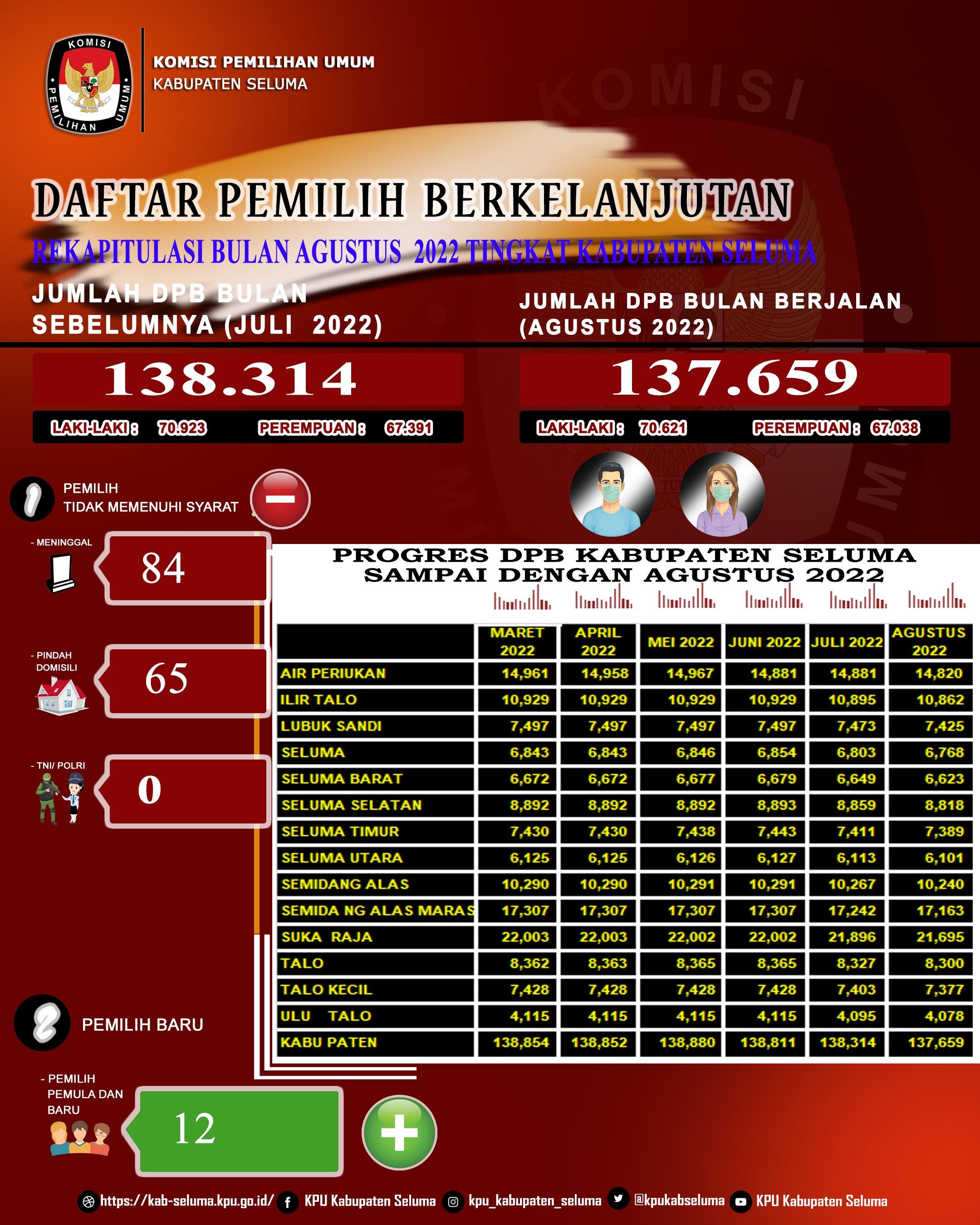 KPU Kabupaten Seluma telah melakukan rekapitulasi Daftar Pemilih Berkelanjutan (DPB) bulan Agustus tahun 2022 yang bersumber dari Tanggapan Masyarakat yang diterima KPU Kabupaten Seluma sampai dengan bulan Agustus 2022.