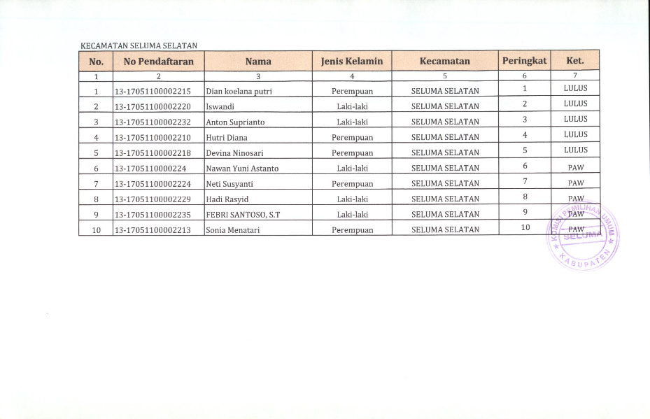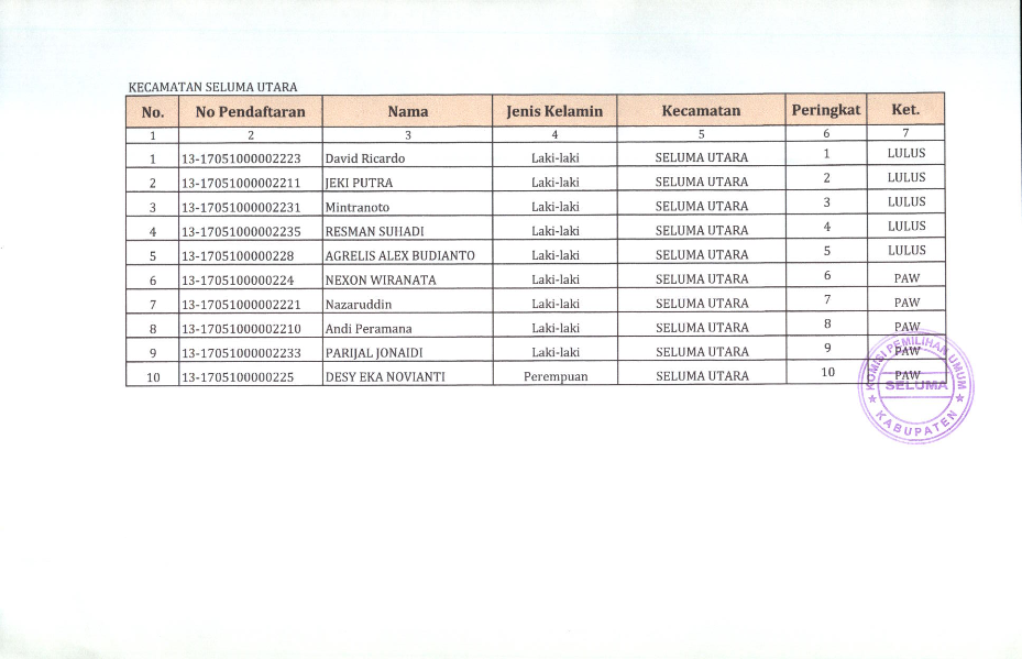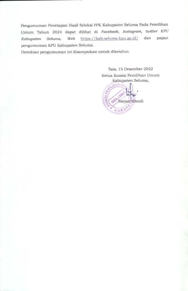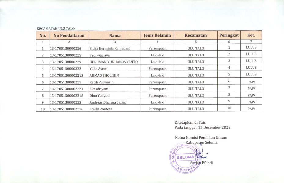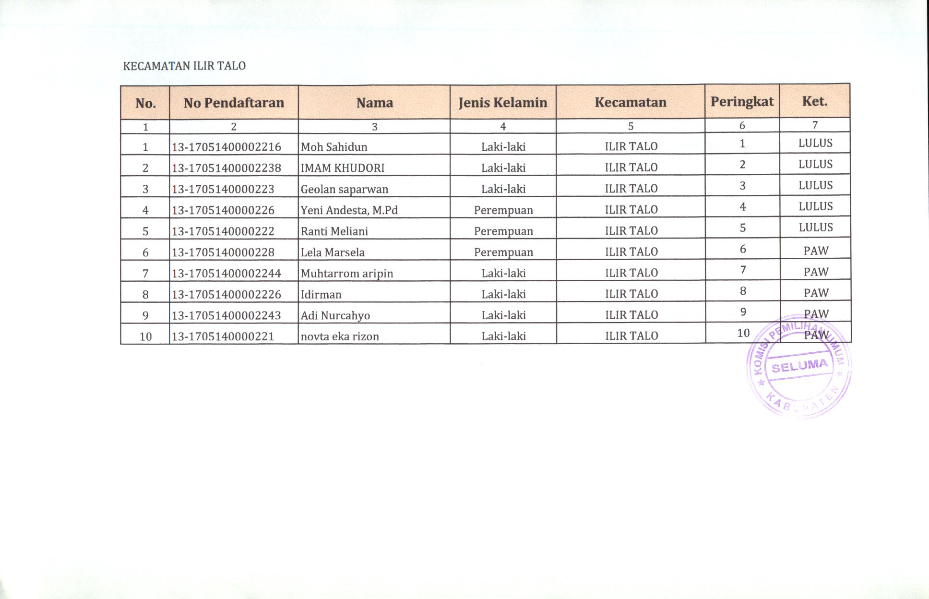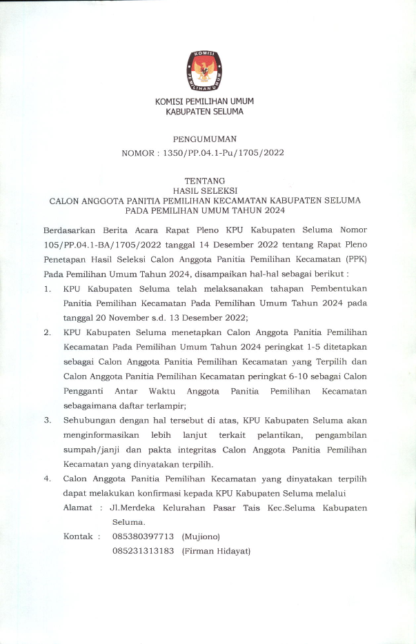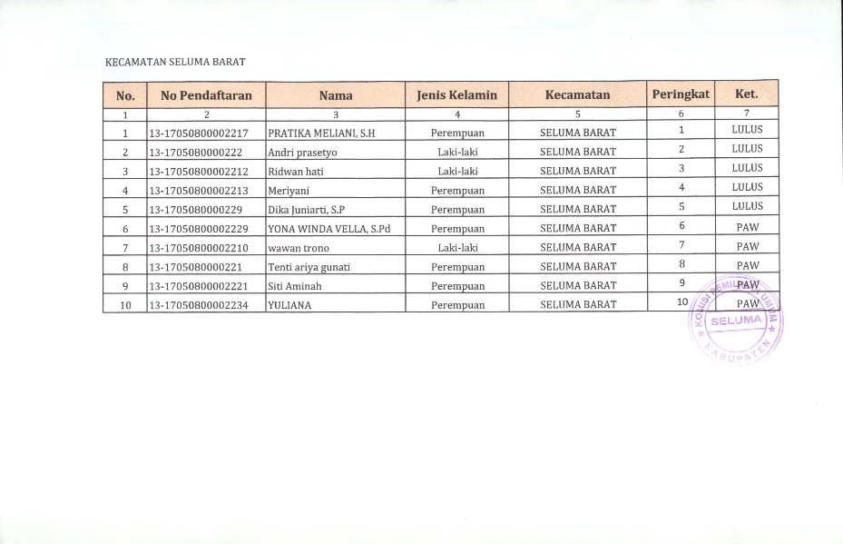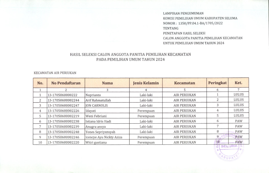 HASIL SELEKSI CALON ANGGOTA PANITIA PEMILIHAN KECAMATAN KABUPATEN SELUMA PADA PEMILIHAN UMUM TAHUN 2024