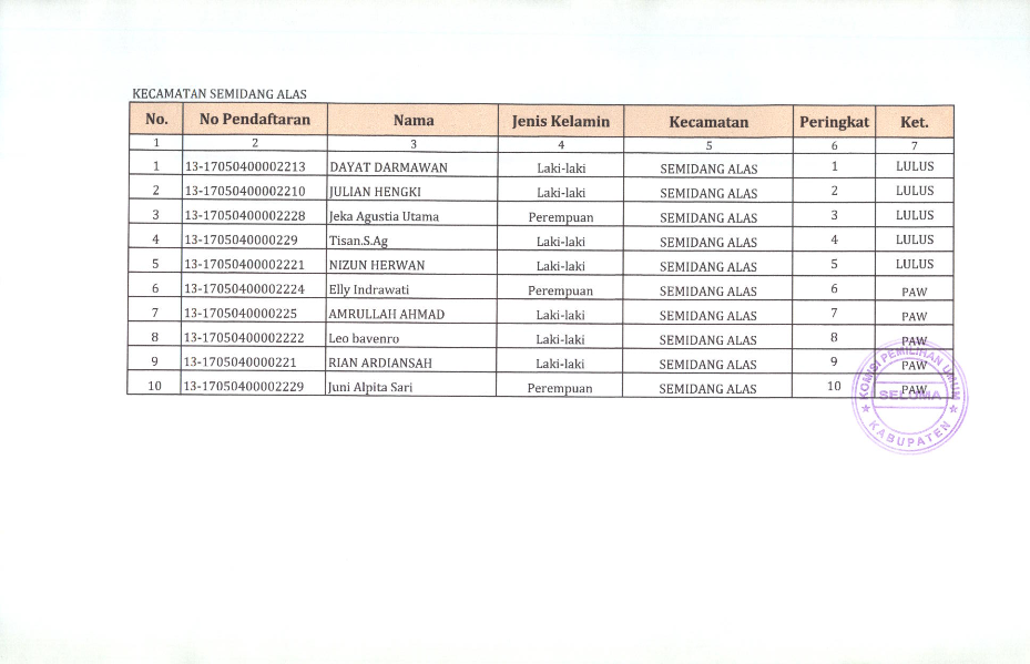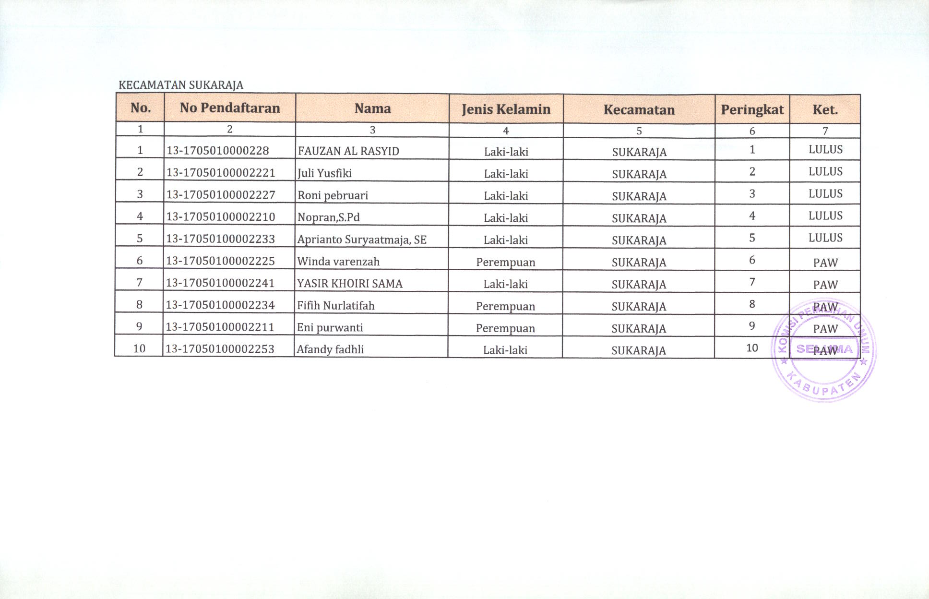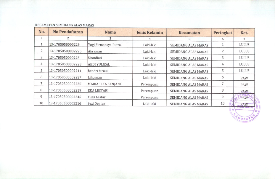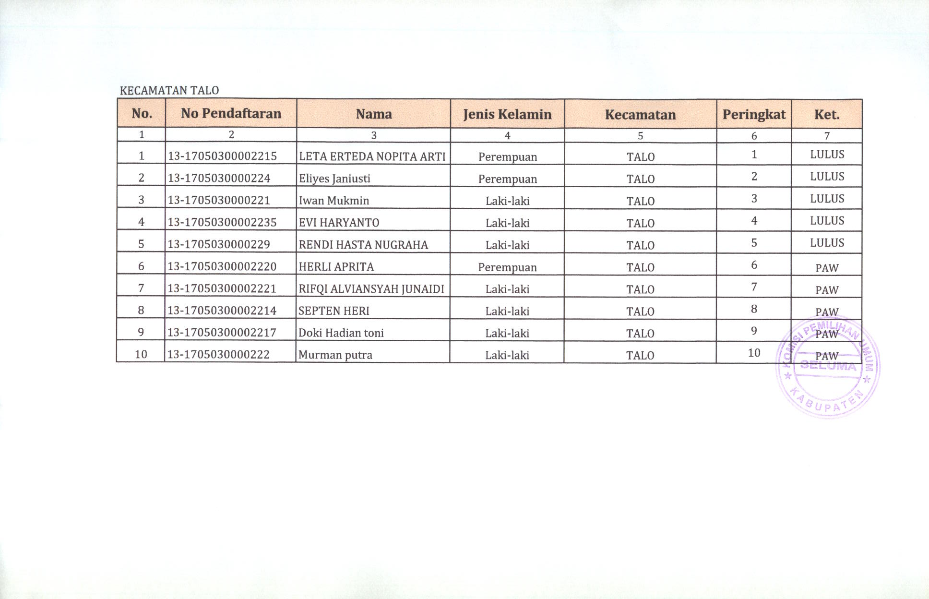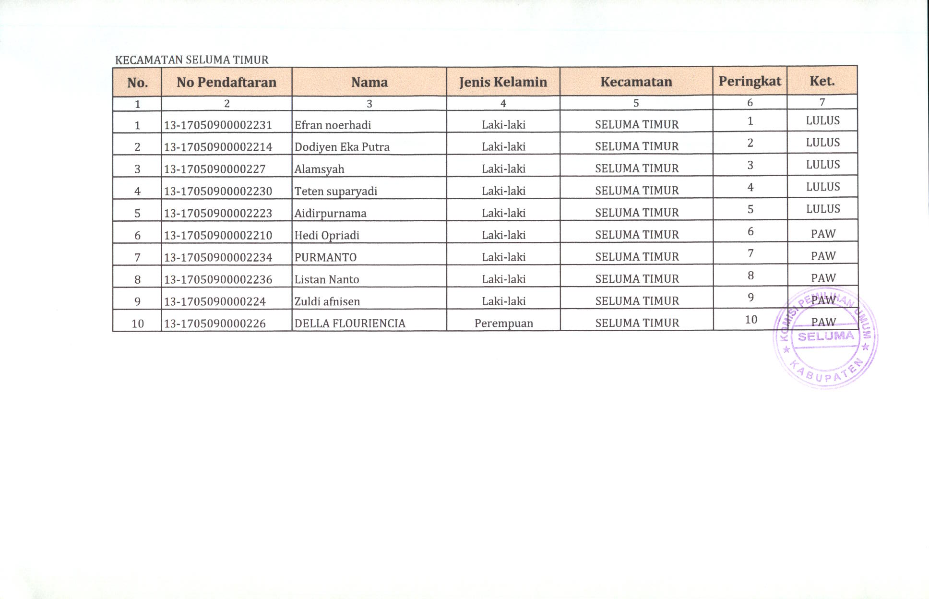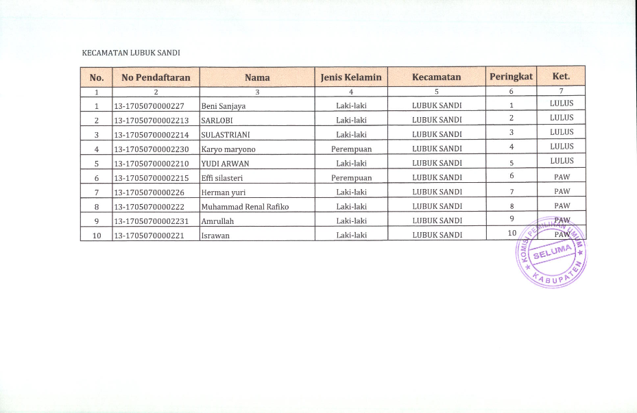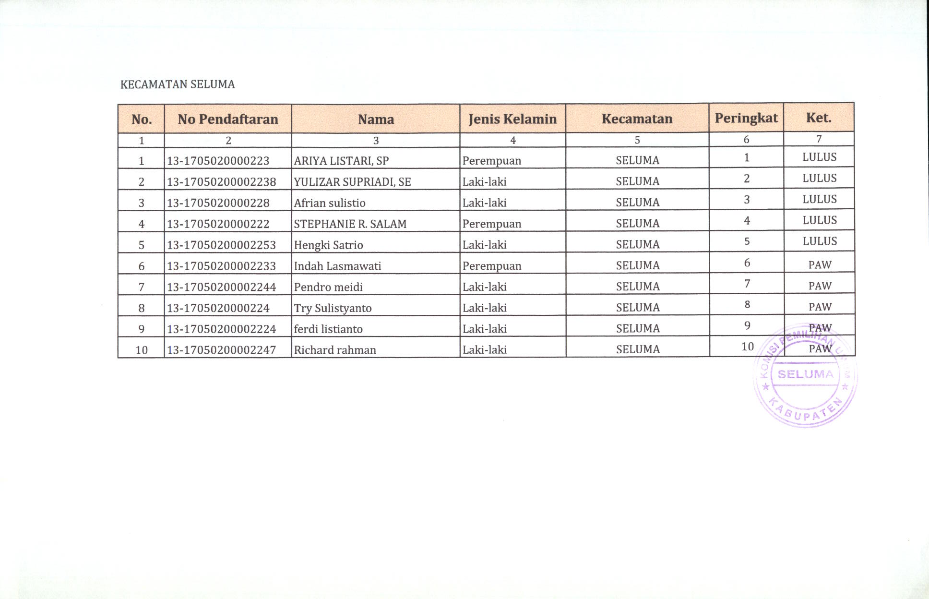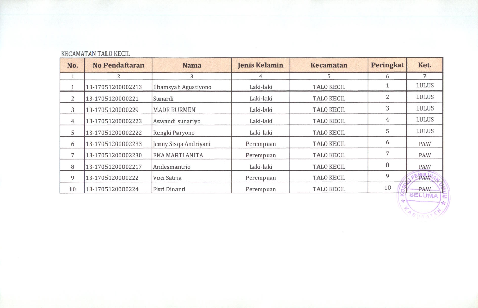 HASIL SELEKSI CALON ANGGOTA PANITIA PEMILIHAN KECAMATAN KABUPATEN SELUMA PADA PEMILIHAN UMUM TAHUN 2024