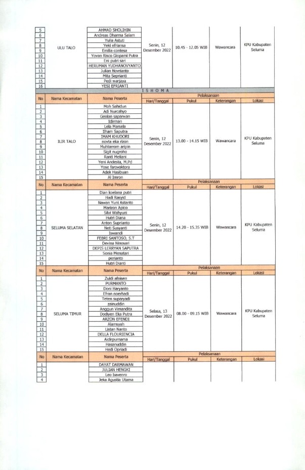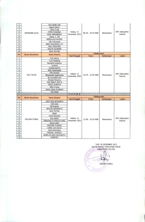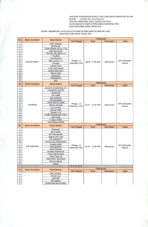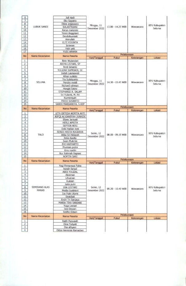 JADWAL WAWANCARA CALON ANGGOTA PPK KABUPATEN SELUMA PADA PEMILIHAN UMUM TAHUN 2024