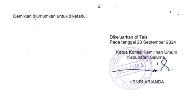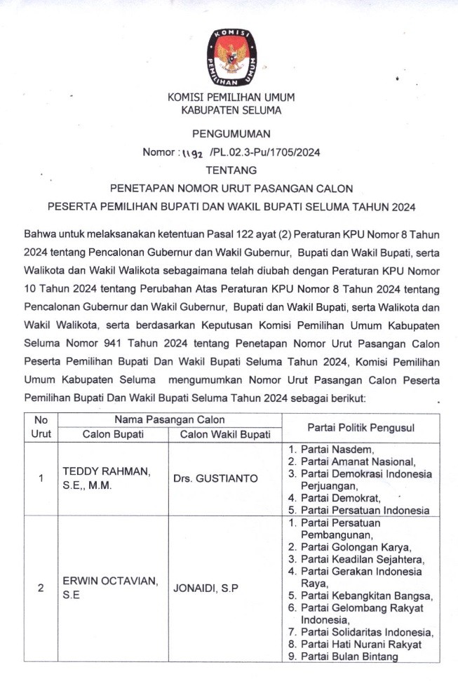 Berdasarkan keputusan Komisi Pemilihan Umum Kabupaten Seluma Nomor 941 Tahun 2024 tentang Penetapan Nomor Urut Pasangan Calon Peserta Pemilihan Bupati dan Wakil Bupati Seluma Tahun 2024, Komisi Pemilihan Umum Kabupaten Seluma Mengumumkan Nomor Urut Pasangan Calon Peserta Pemilihan Bupati dan Wakil Bupati Seluma Tahun 2024.