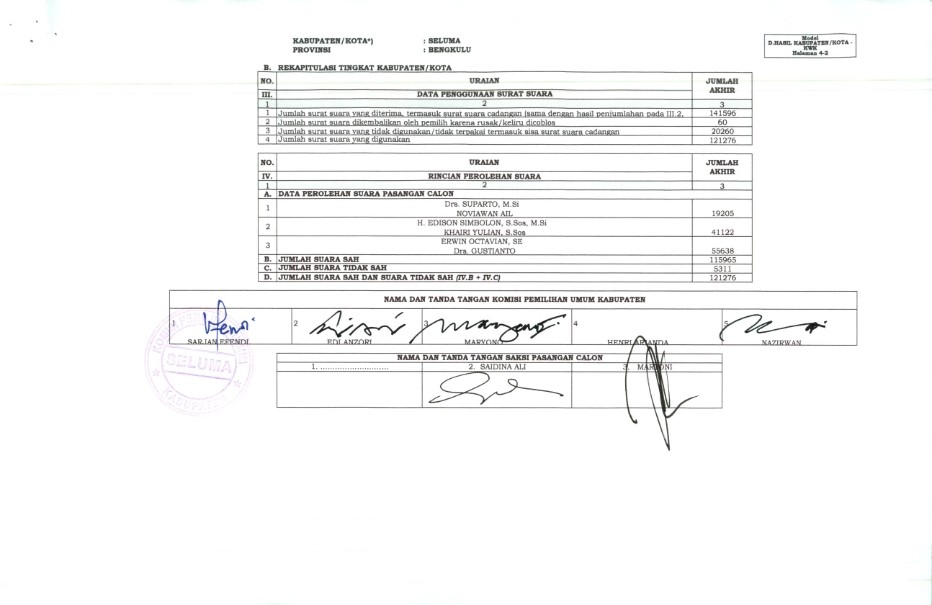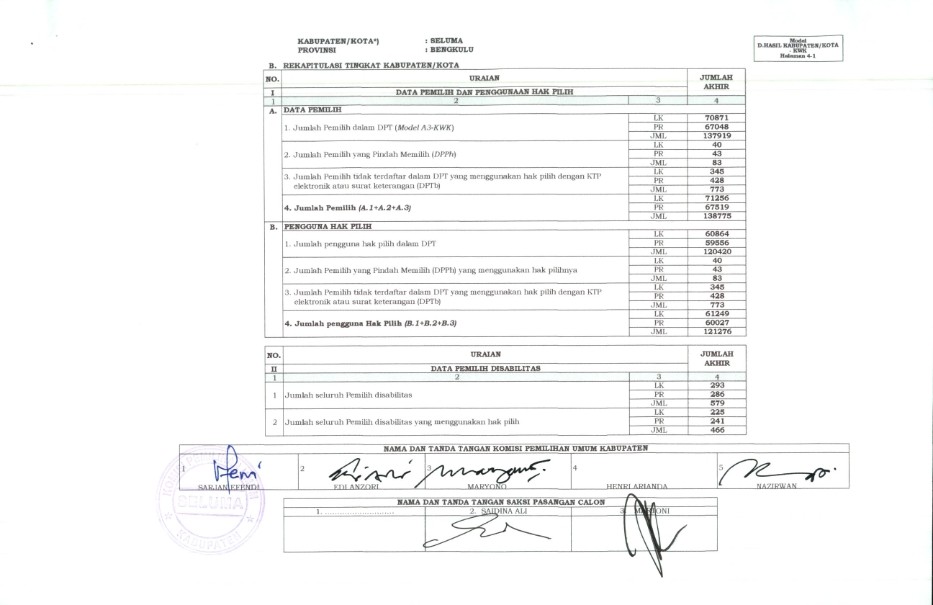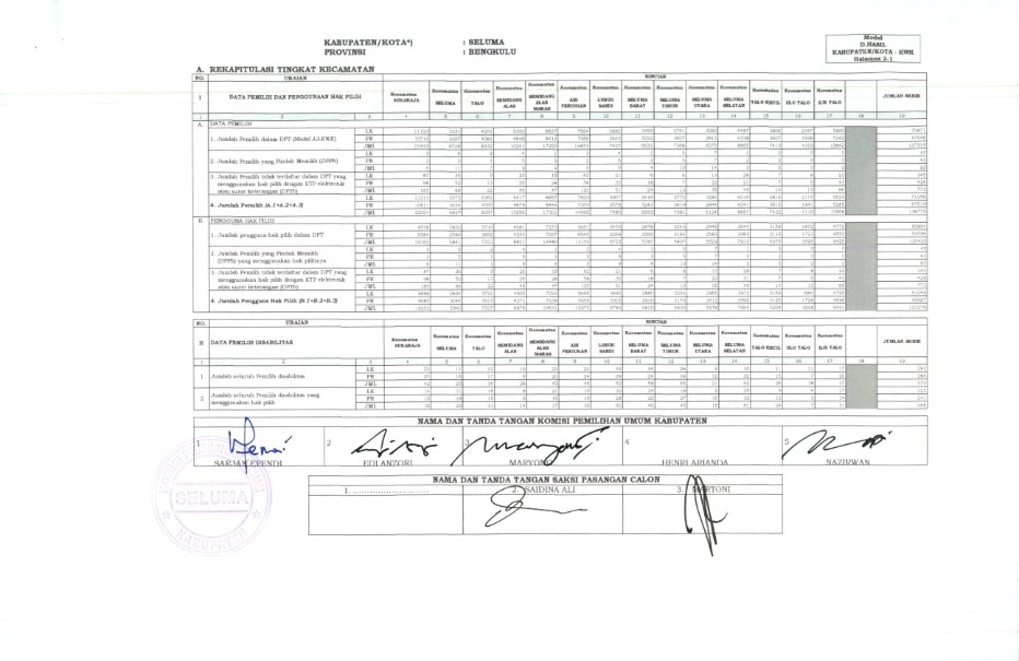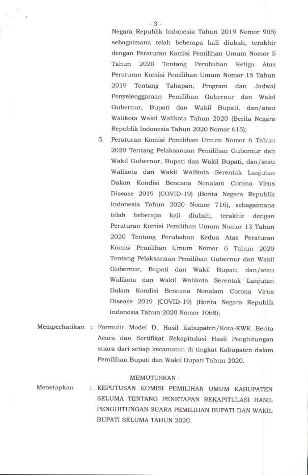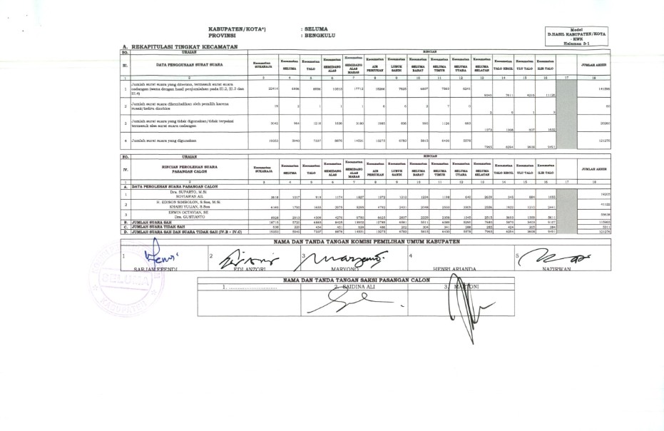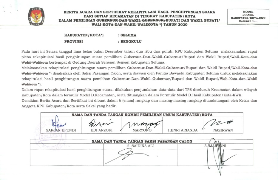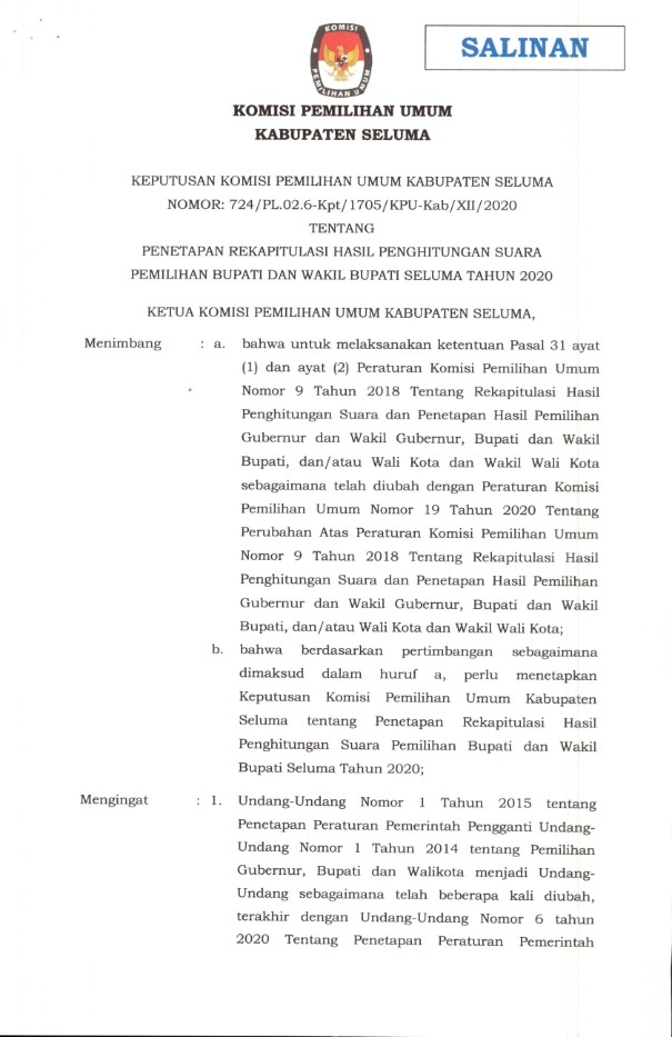 PENETAPAN REKAPITULASI HASIL PENGHITUNGAN SUARA PEMILIHAN BUPATI DAN WAKIL BUPATI SELUMA TAHUN 2020