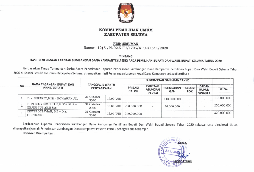 PENGUMUMAN Nomor : 1215 Tahun 2020 Tentang Hasil Penerimaan Laporan Sumbangan Dana Kampanye (LPSDK) Pemilihan Bupati dan Wakil Bupati Seluma Tahun 2020