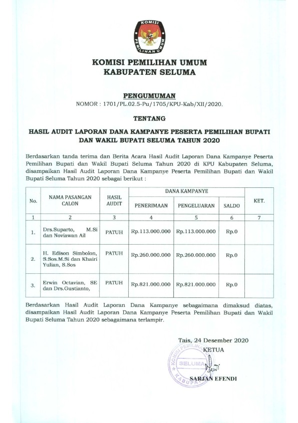 PENGUMUMAN Nomor : 1701 Tahun 2020 Tentang Hasil Audit Laporan Dana Kampanye Peserta Pemilihan Bupati dan Wakil Bupati Seluma Tahun 2020 Kamis, 24 Desember 2020 00:00 635 File Dokumen Lengkap Dapat DIDOWNLOAD Disini Bagikan: Telah dilihat 635 kali