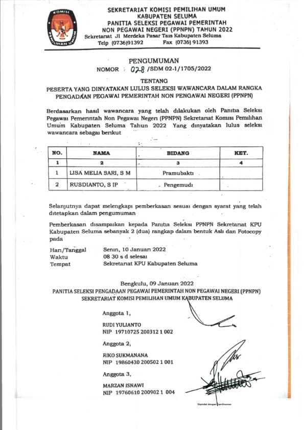 PENGUMUMAN PESERTA LULUS SELEKSI WAWANCARA PENGADAAN PEGAWAI PEMERINTAH NON PEGAWAI NEGERI (PPNPN) SEKRETARIAT KPU KABUPATEN SELUMA TAHUN 2022