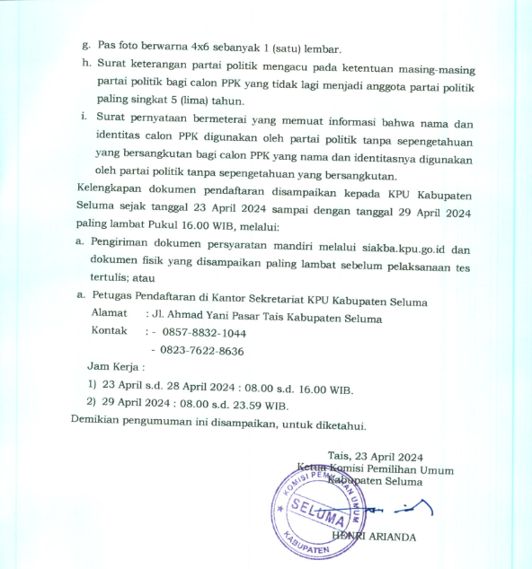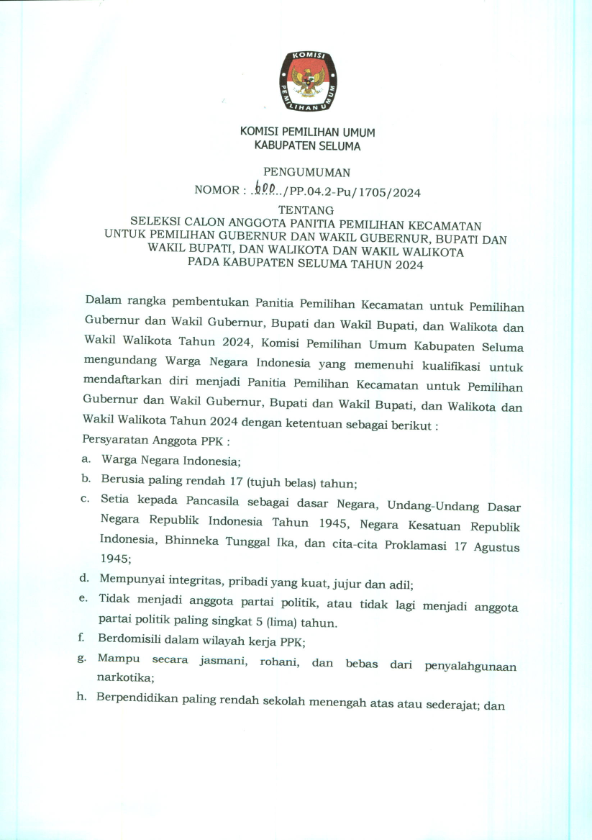 PENGUMUMAN SELEKSI CALON ANGGOTA PANITIA PEMILIHAN KECAMATAN UNTUK PEMILIHAN GUBERNUR DAN WAKIL GUBERNUR, BUPATI DAN WAKIL BUPATI PADA KABUPATEN SELUMA TAHUN 2024 Selasa, 23 April 2024 07:00 786 Dokumen Lengkap Dapat di DOWNLOAD DI SINI Bagikan: Telah dilihat 786 kali